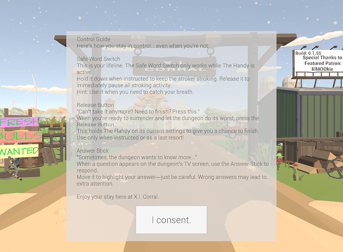 Long term, the plan is to have an interactive onboarding process when you first arrive in the dungeon. “Nod your head Yes or No. Can you follow my instructions? Hmm, let’s find out. Hold down the safe word switch and show me. Very good, now don’t let that go unless you want the fun to stop.” Kind of thing. But that was half finished and I wanted audio dialogue and then I wanted to expand it even further with other features, and then I finally accepted that I had fallen victim to scope creep. lol. so I put that aside along with a bunch of other features for a while to get the skeletal testing versions out.