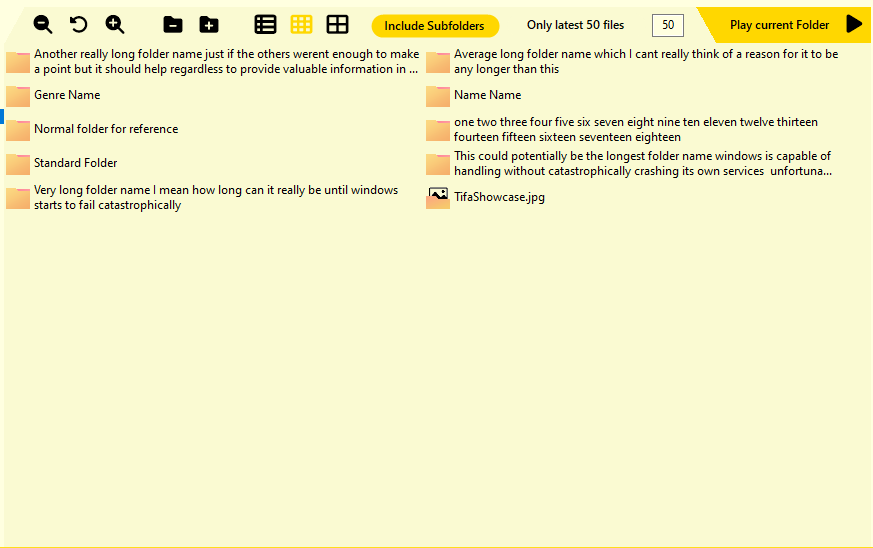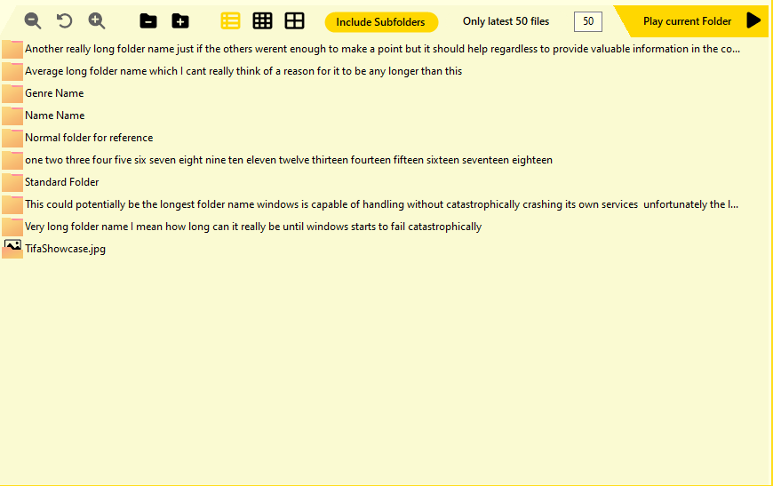 You mean in the folder browser, right? I should add a similar view switcher like in the list browser. Can you tell me if itās fine for you there? With the view set to list + dragging the window to a bigger size, there shouldnāt be a limit for folder/file names.